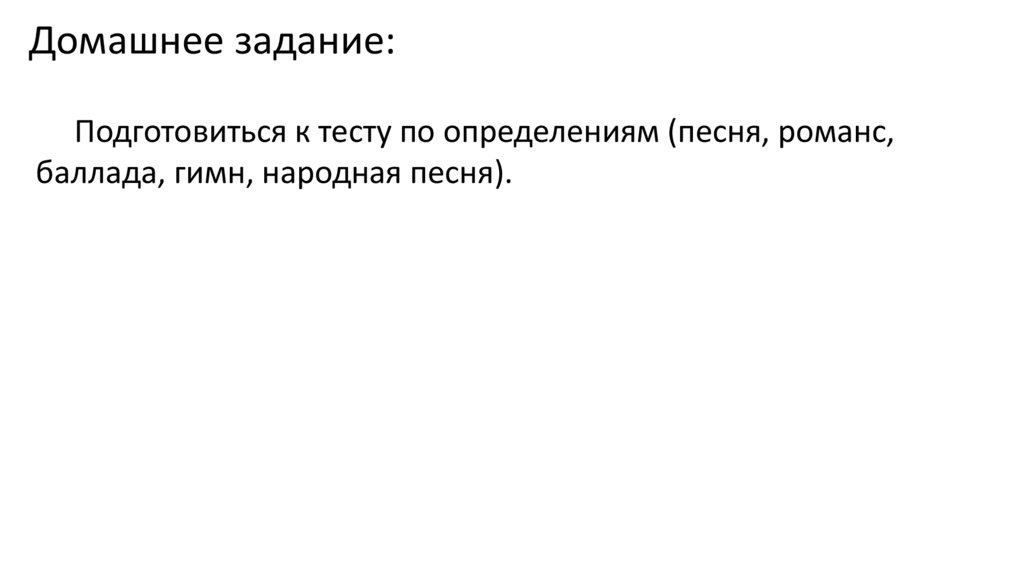 Домашнее задание:Подготовиться к тесту по определениям (песня, романс,