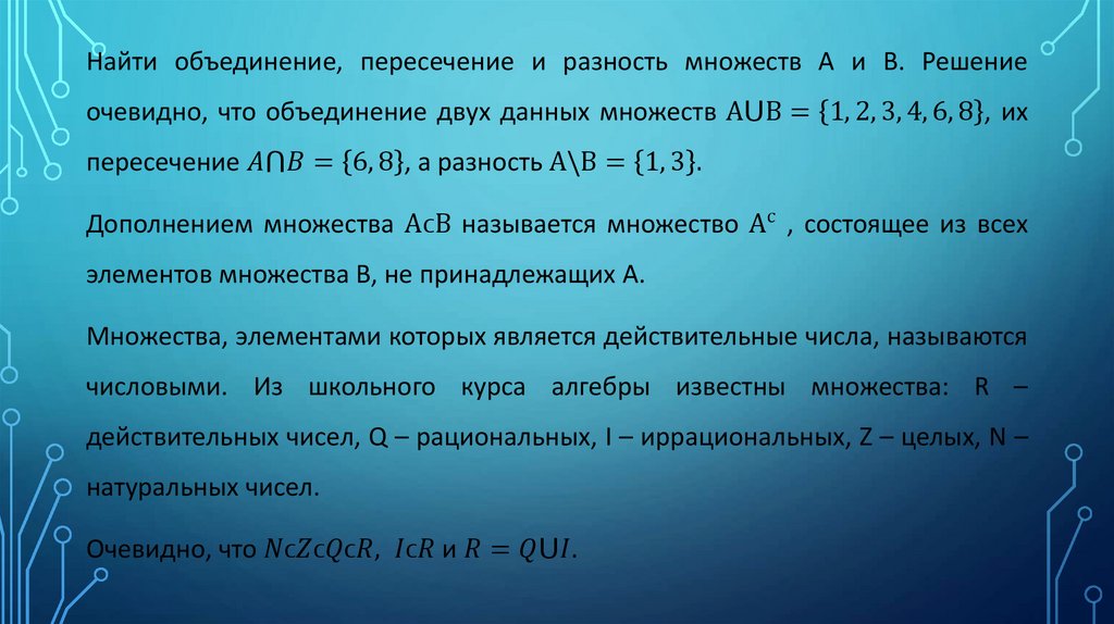 1.Понятие о числовых множествах. Операции над множествами.Понятие множества принадлежит к числу первичных, не определяемых через более