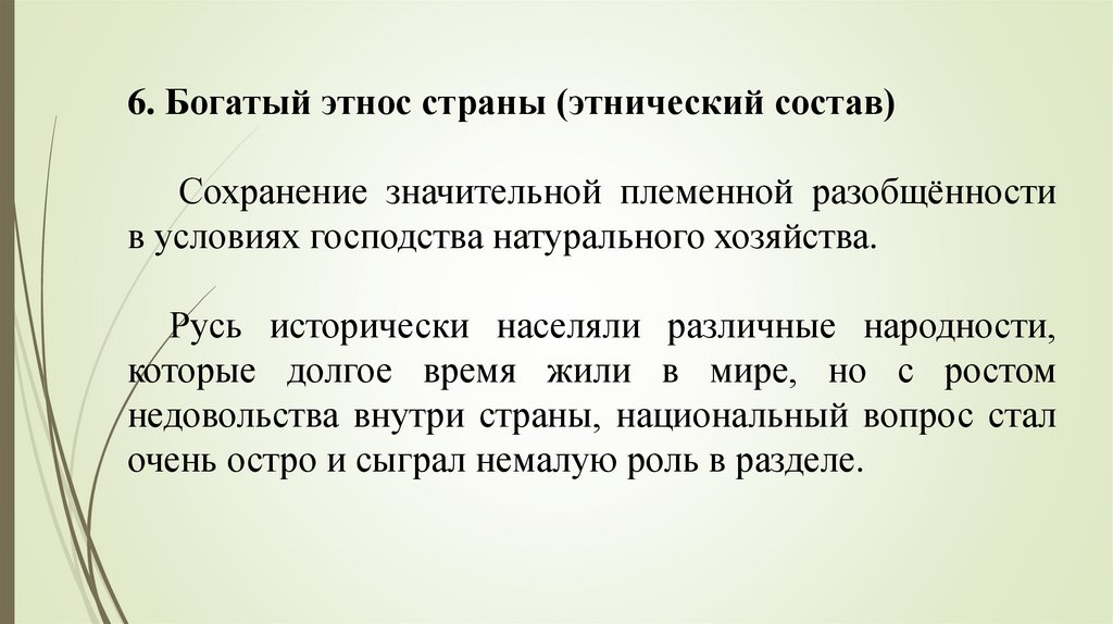 6. Богатый этнос страны (этнический состав)Сохранение значительной племенной разобщённости