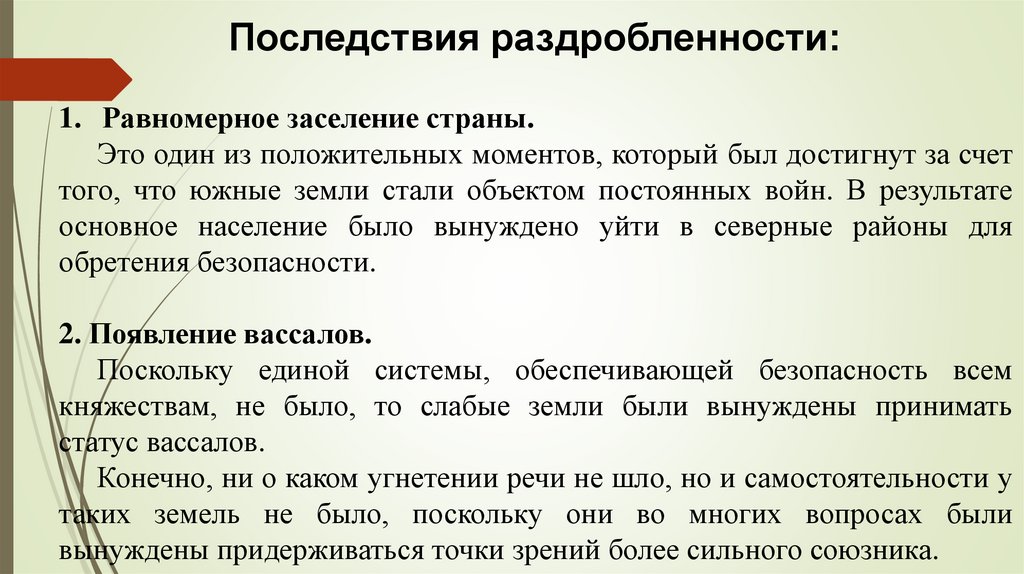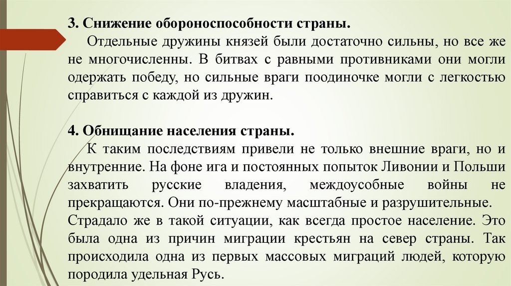 3. Снижение обороноспособности страны.Отдельные дружины князей были достаточно сильны, но все же
