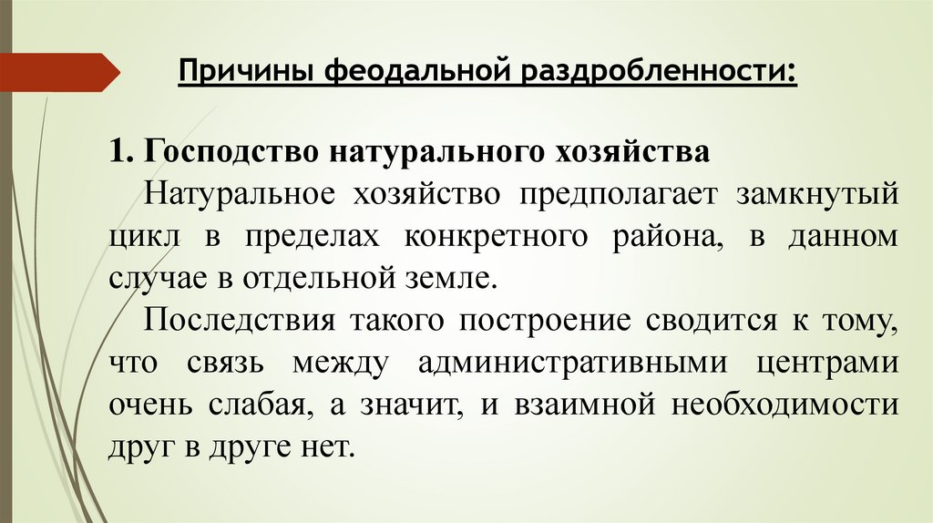 Причины феодальной раздробленности:1. Господство натурального хозяйства