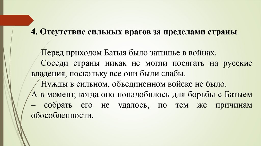 4. Отсутствие сильных врагов за пределами страныПеред приходом Батыя было затишье в войнах.