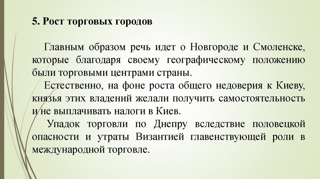 5. Рост торговых городовГлавным образом речь идет о Новгороде и Смоленске,