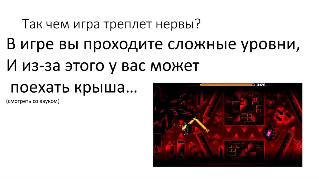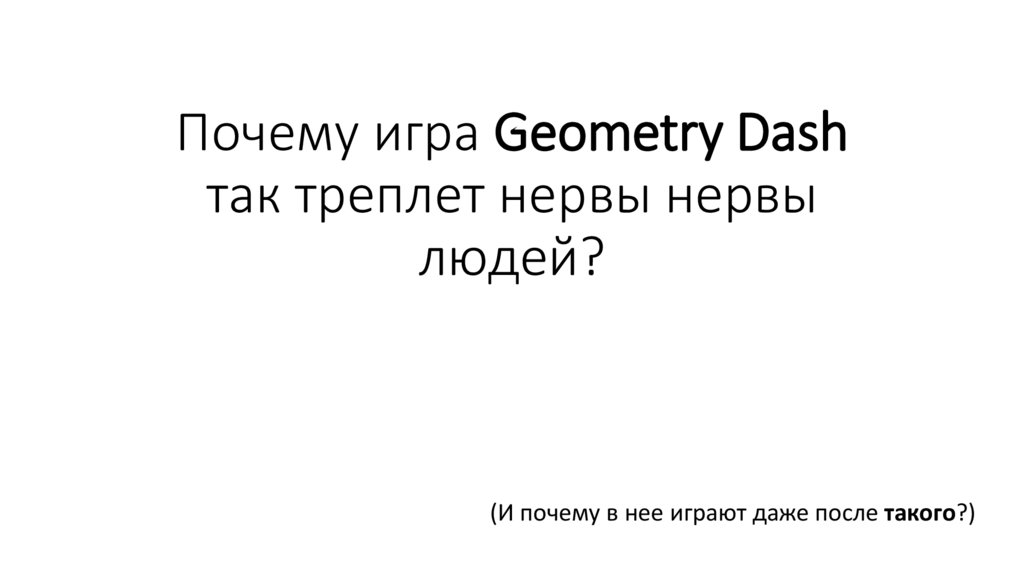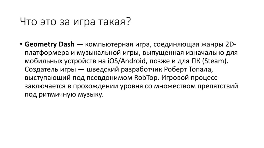 Что это за игра такая?• Geometry Dash — компьютерная игра, соединяющая жанры 2Dплатформера и музыкальной игры, выпущенная изначально для