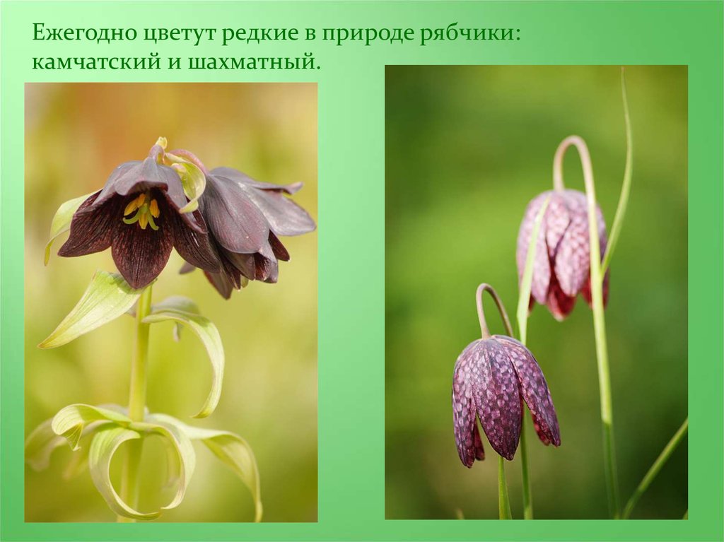 Ежегодно цветут редкие в природе рябчики:камчатский и шахматный.