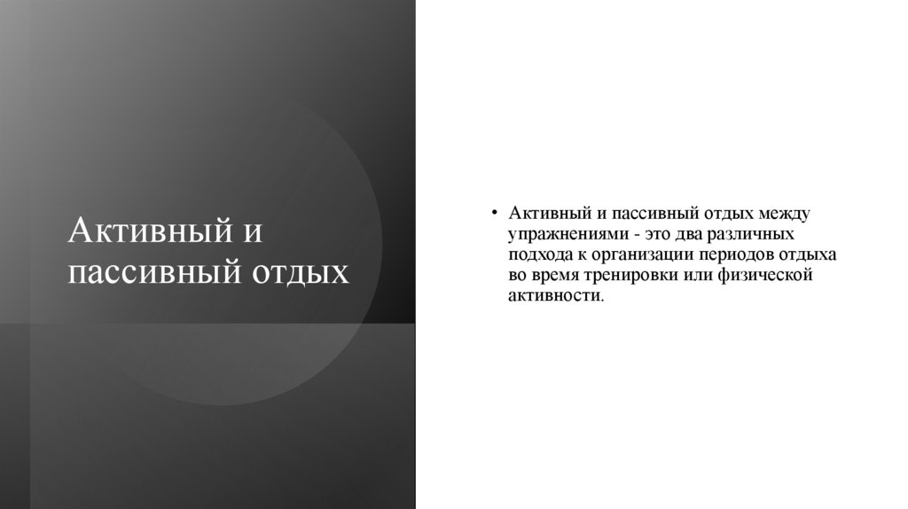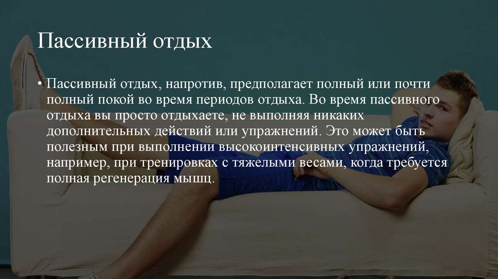 Пассивный отдых• Пассивный отдых, напротив, предполагает полный или почти