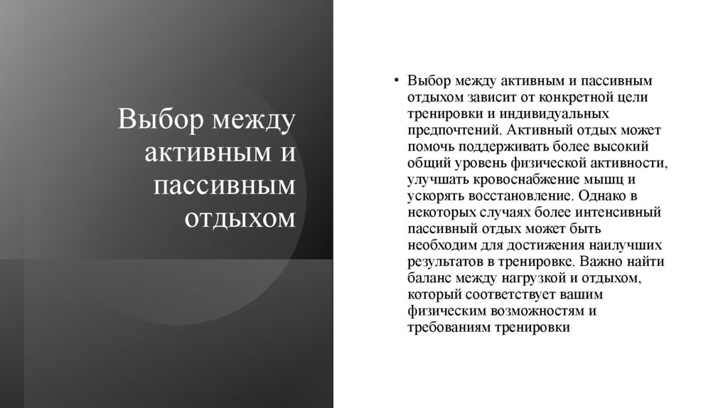• Активный и пассивный отдых между