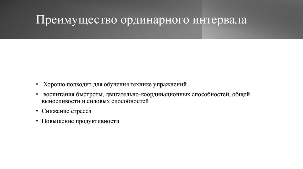 Преимущество ординарного интервала• Хорошо подходит для обучения технике упражнений