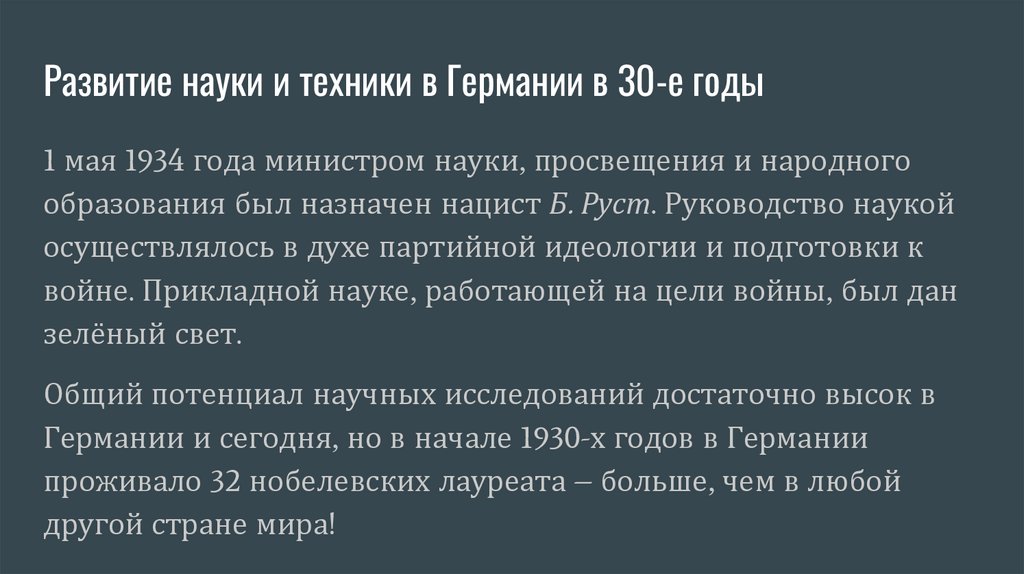 Развитие науки и техники в Германии в 30-е годы1 мая 1934 года министром науки, просвещения и народного