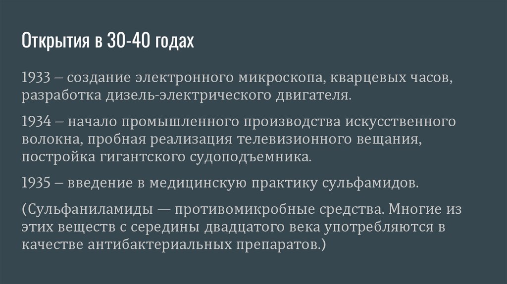 Открытия в 30-40 годах1933 – создание электронного микроскопа, кварцевых часов,