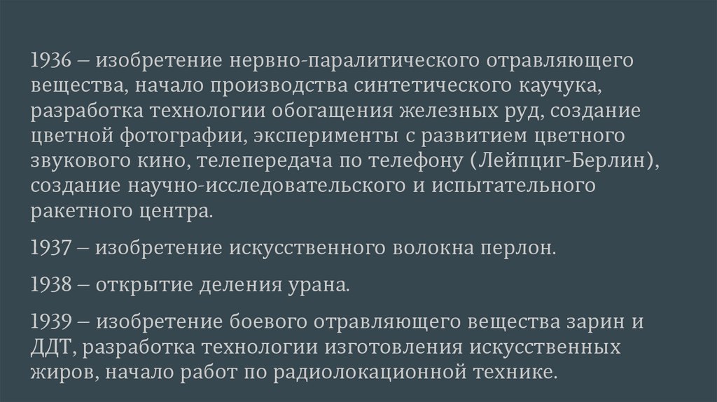 1936 – изобретение нервно-паралитического отравляющеговещества, начало производства синтетического каучука,