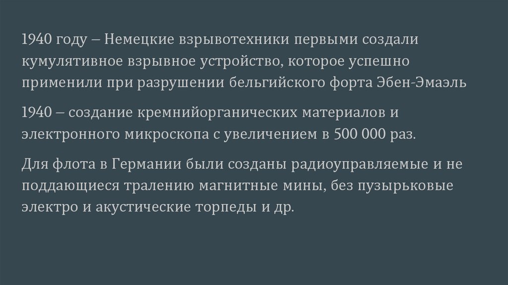 1940 году – Немецкие взрывотехники первыми создаликумулятивное взрывное устройство, которое успешно