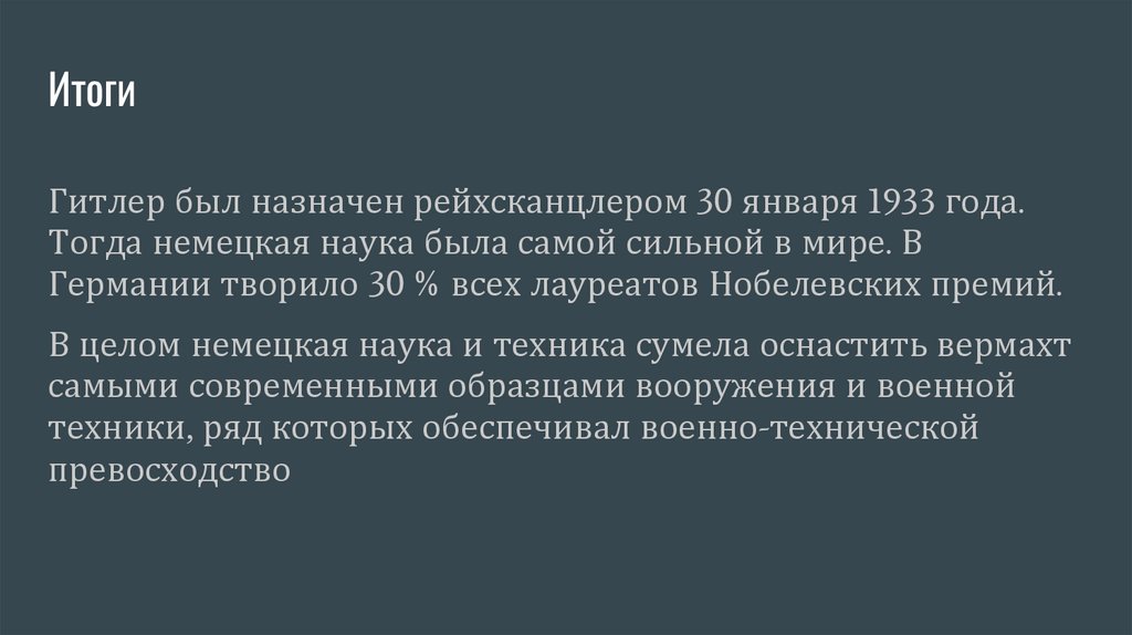 ИтогиГитлер был назначен рейхсканцлером 30 января 1933 года.
