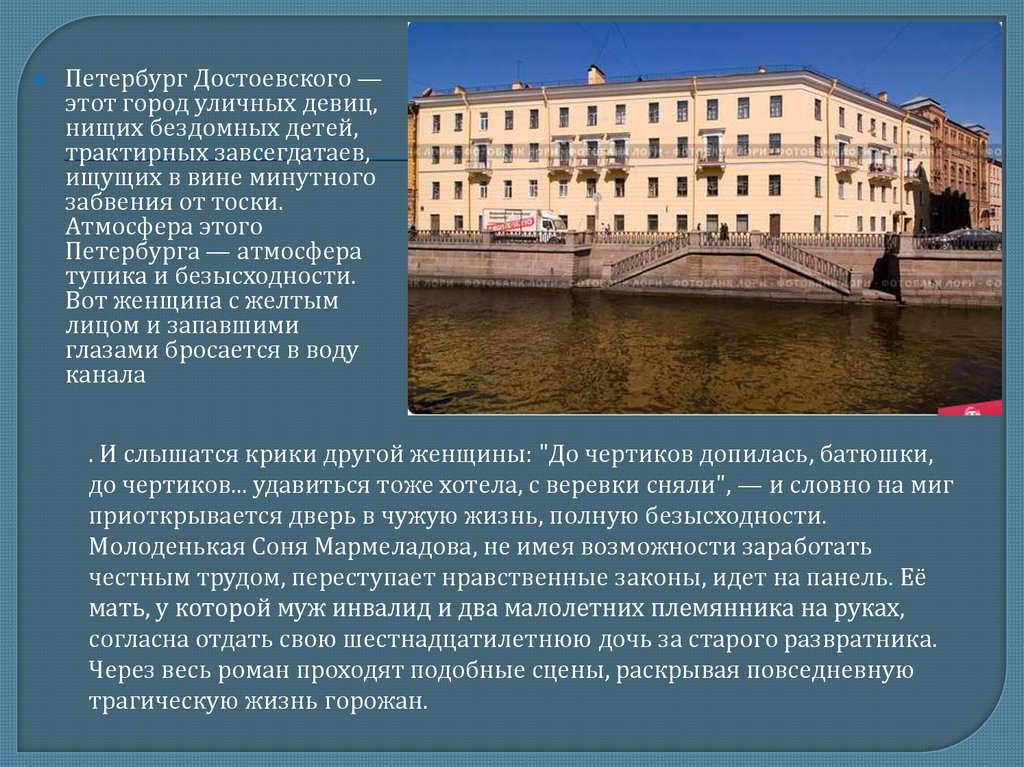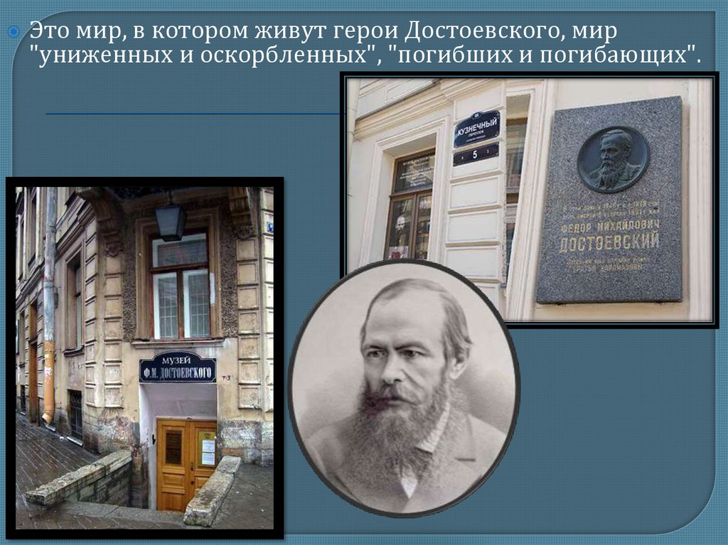 Это мир, в котором живут герои Достоевского, мир"униженных и оскорбленных", "погибших и погибающих".