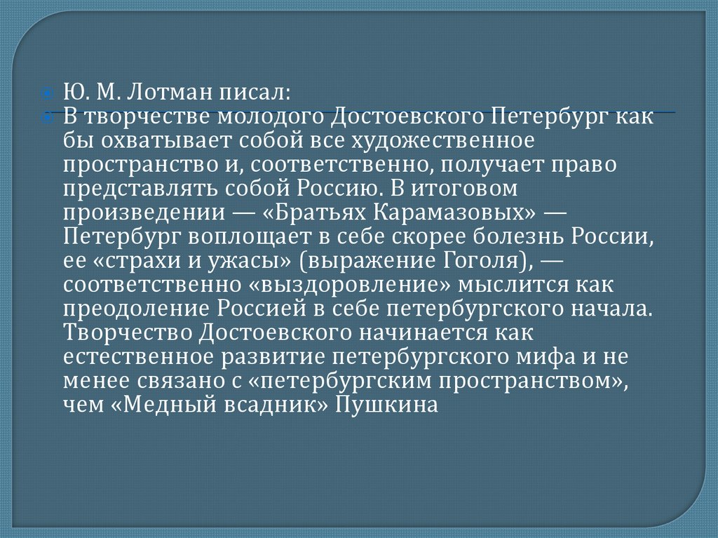 Ю. М. Лотман писал:В творчестве молодого Достоевского Петербург как