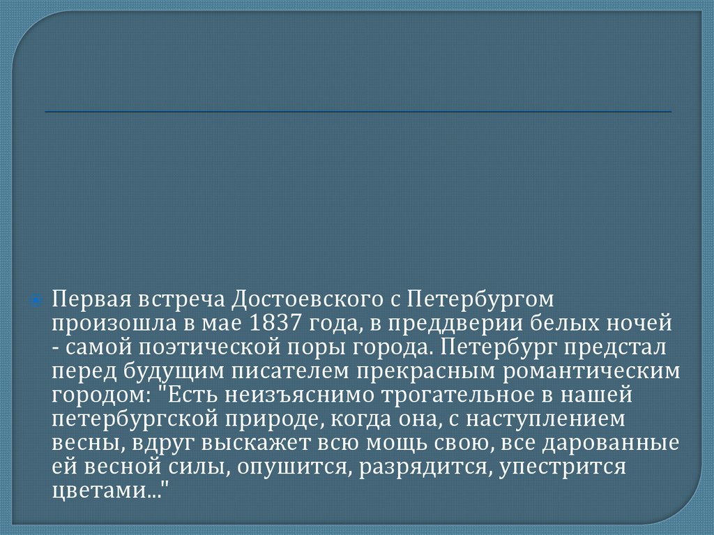 Первая встреча Достоевского с Петербургомпроизошла в мае 1837 года, в преддверии белых ночей