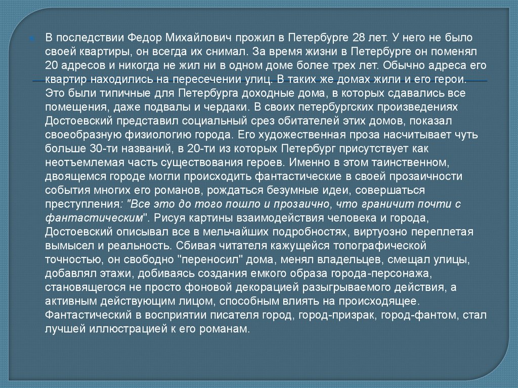 В последствии Федор Михайлович прожил в Петербурге 28 лет. У него не былосвоей квартиры, он всегда их снимал. За время жизни в Петербурге он поменял