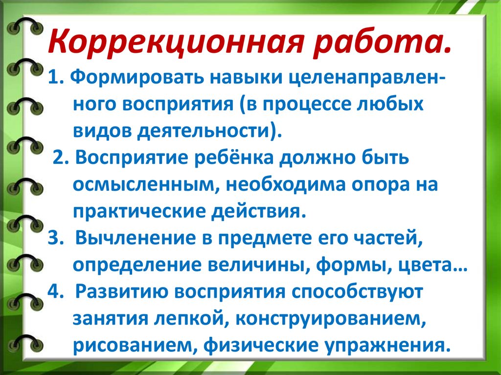 Коррекционная работа.1. Формировать навыки целенаправленного восприятия (в процессе любых