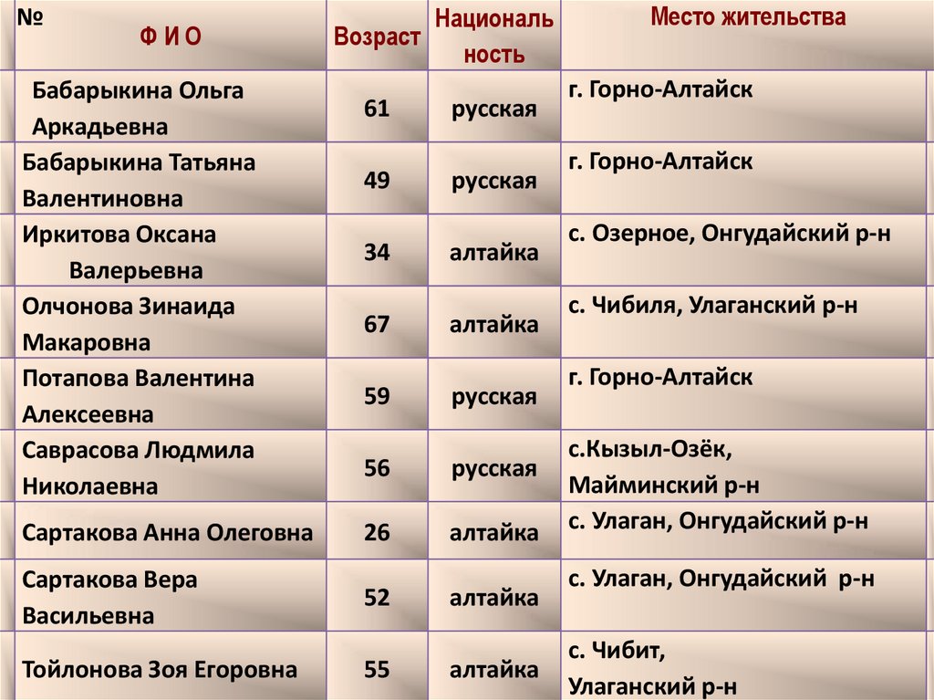 проживающих в г. Горно-Алтайск, а также в различных районах