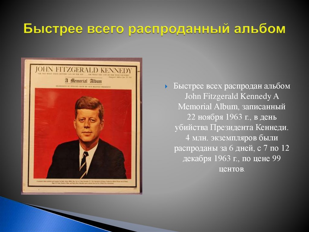Быстрее всех распродан альбомJohn Fitzgerald Kennedy A
