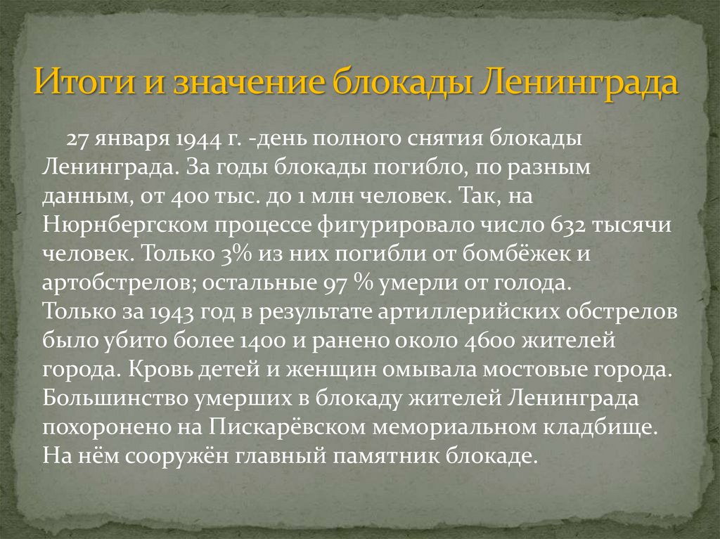 27 января 1944 г. -день полного снятия блокадыЛенинграда. За годы блокады погибло, по разным