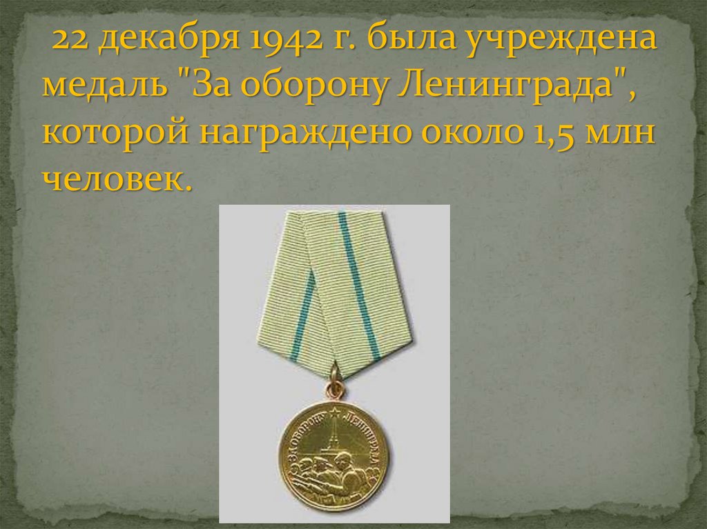 22 декабря 1942 г. была учрежденамедаль "За оборону Ленинграда",