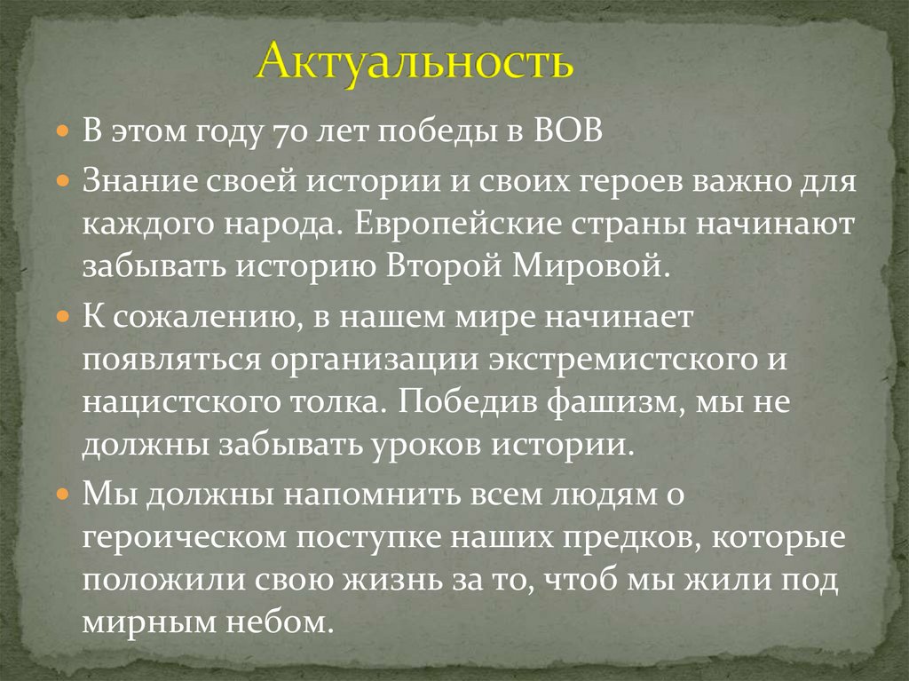 В этом году 70 лет победы в ВОВЗнание своей истории и своих героев важно для