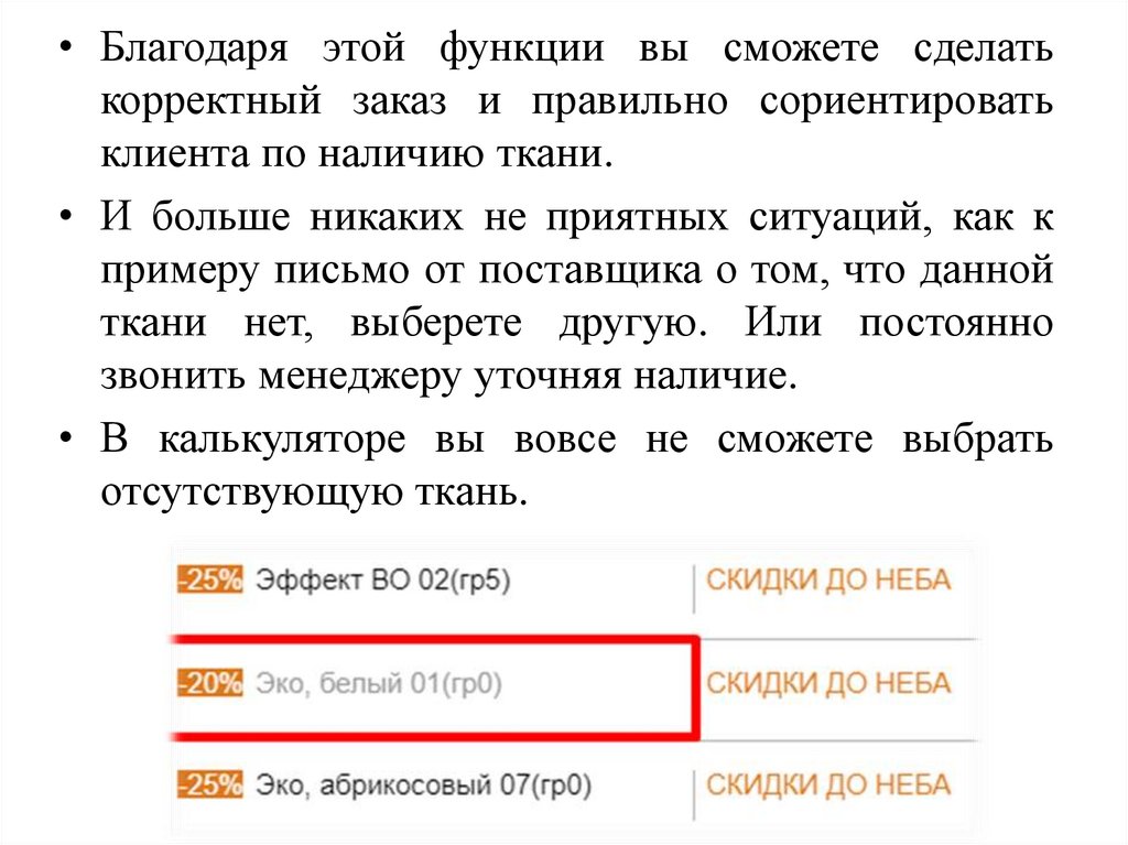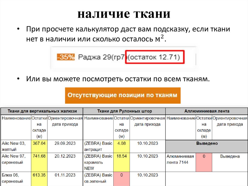 наличие ткани• При просчете калькулятор даст вам подсказку, если ткани