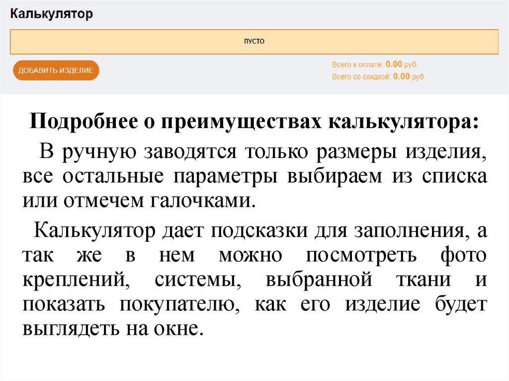Подробнее о преимуществах калькулятора:В ручную заводятся только размеры изделия,