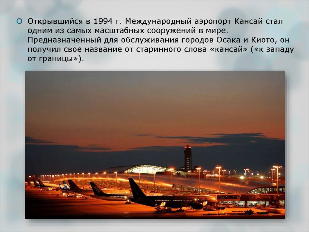 Открывшийся в 1994 г. Международный аэропорт Кансай сталодним из самых масштабных сооружений в мире.