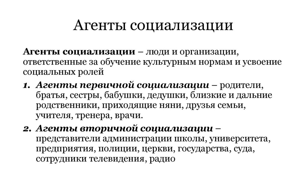 Агенты социализацииАгенты социализации – люди и организации,