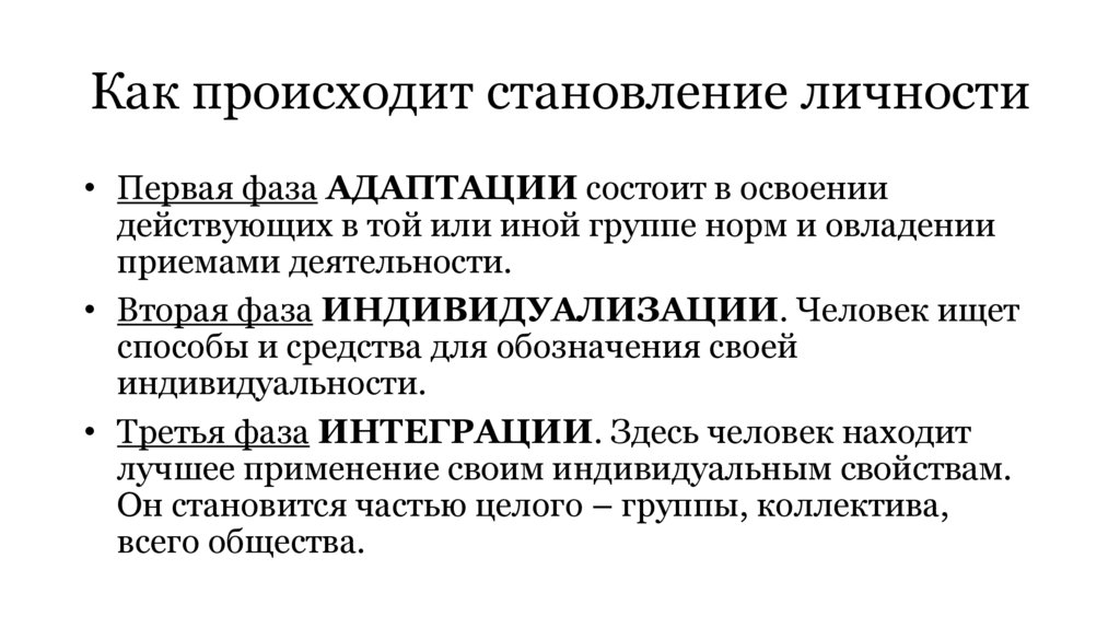 Как происходит становление личности• Первая фаза АДАПТАЦИИ состоит в освоении