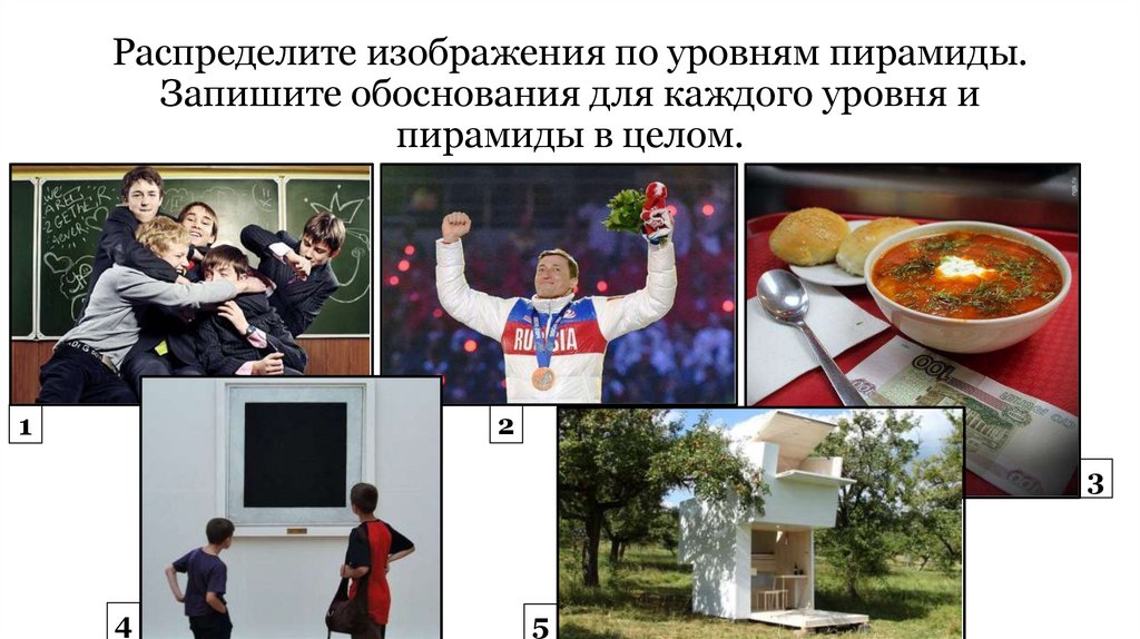 Распределите изображения по уровням пирамиды.Запишите обоснования для каждого уровня и