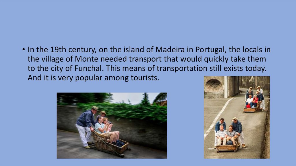 • In the 19th century, on the island of Madeira in Portugal, the locals inthe village of Monte needed transport that would quickly take them