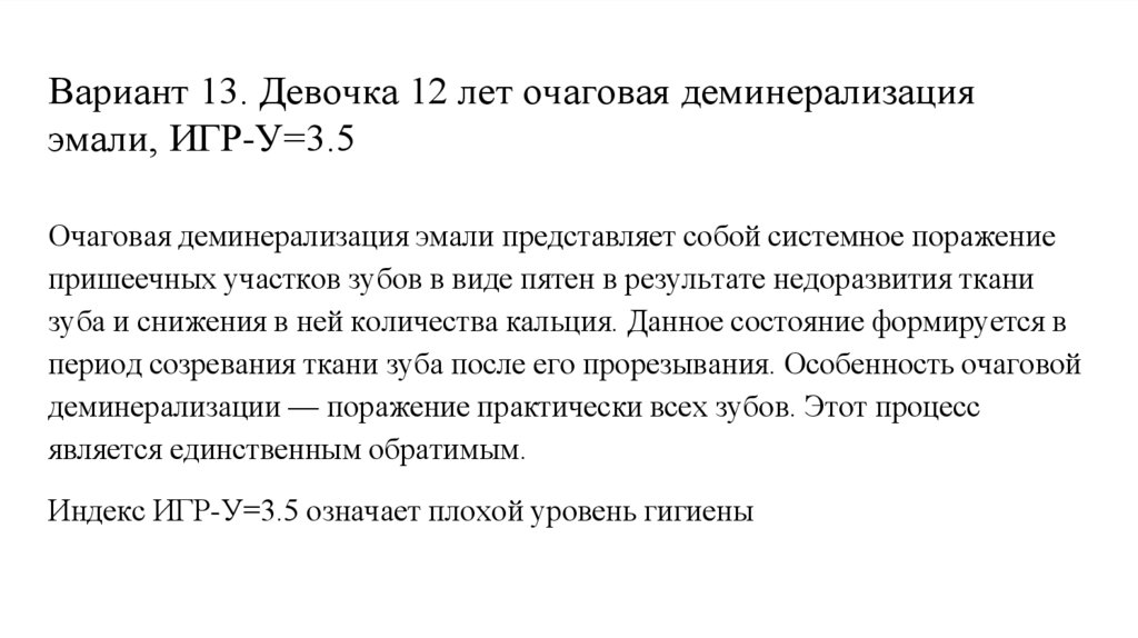 Вариант 13. Девочка 12 лет очаговая деминерализацияэмали, ИГР-У=3.5