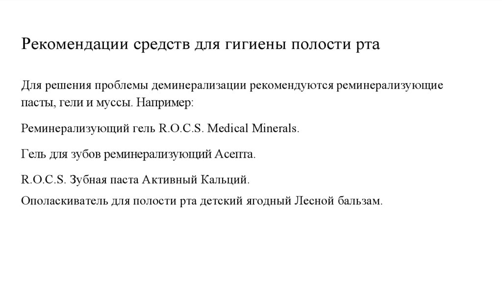 Рекомендации средств для гигиены полости ртаДля решения проблемы деминерализации рекомендуются реминерализующие
