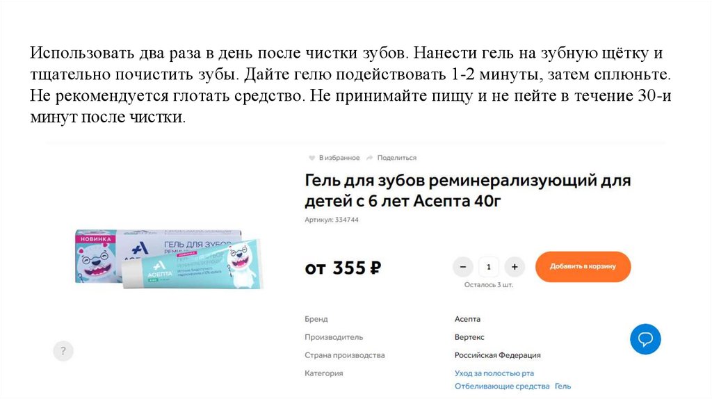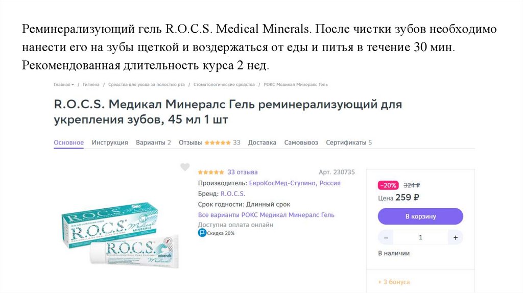 Реминерализующий гель R.O.C.S. Medical Minerals. После чистки зубов необходимонанести его на зубы щеткой и воздержаться от еды и питья в течение 30 мин.