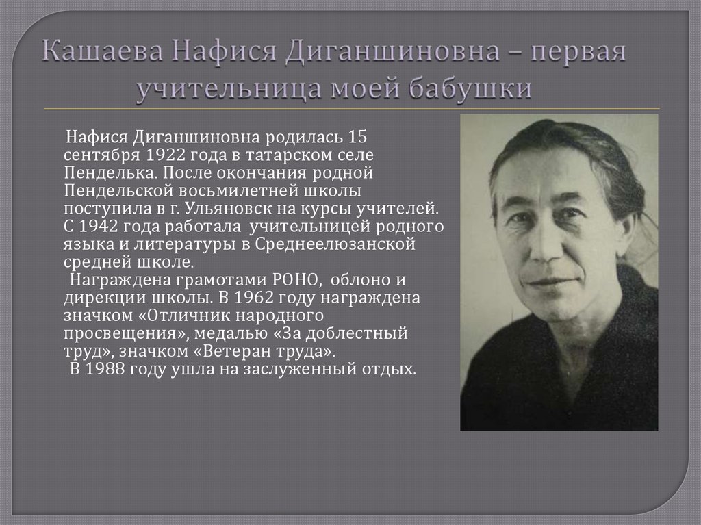 Нафися Диганшиновна родилась 15сентября 1922 года в татарском селе