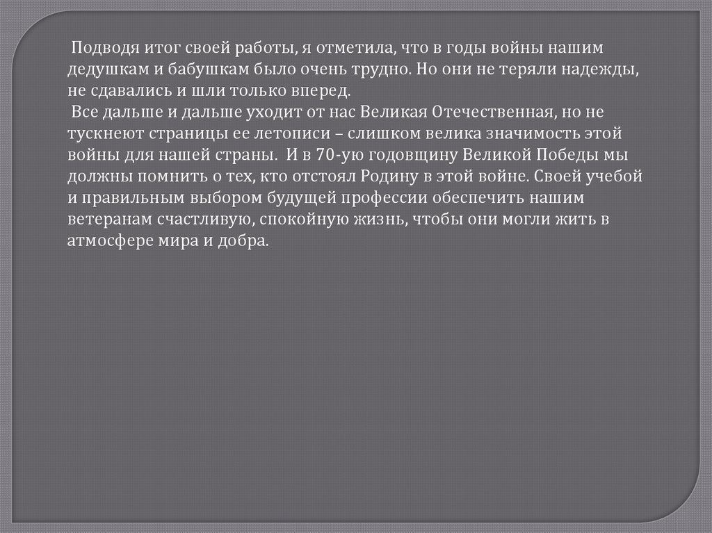 Подводя итог своей работы, я отметила, что в годы войны нашимдедушкам и бабушкам было очень трудно. Но они не теряли надежды,