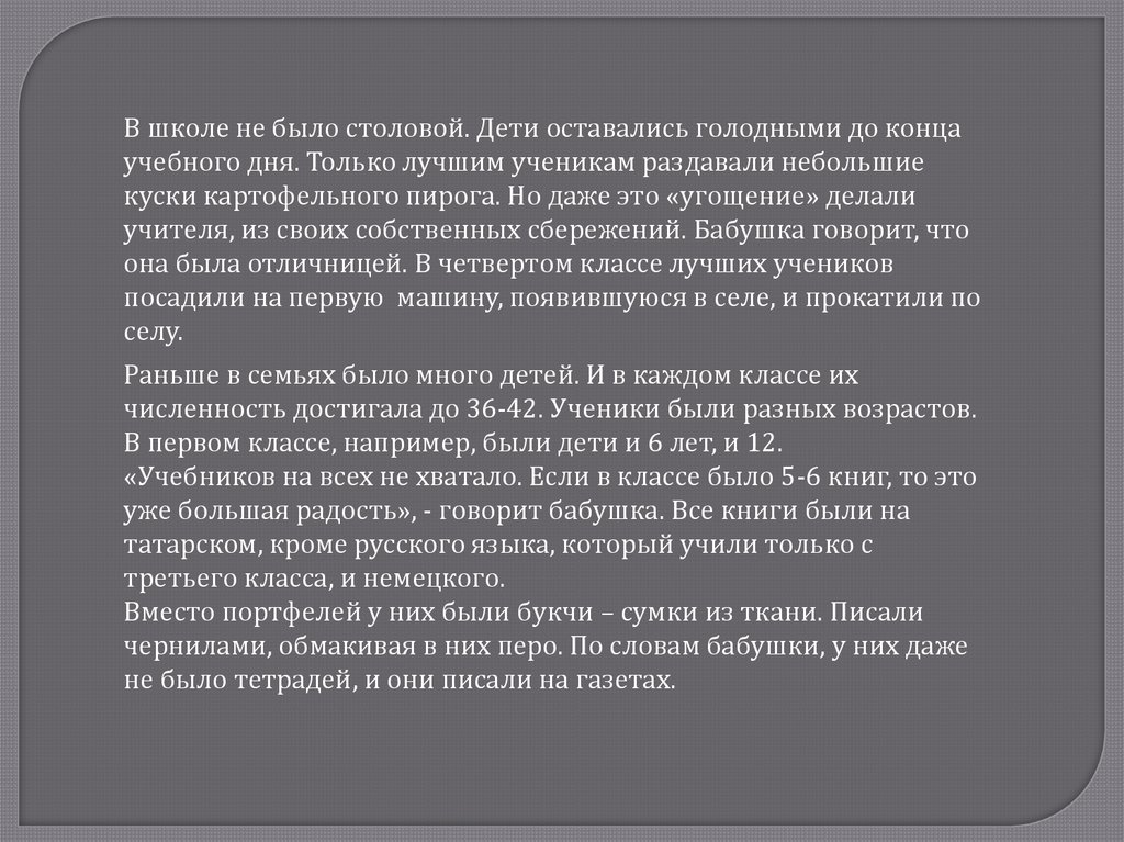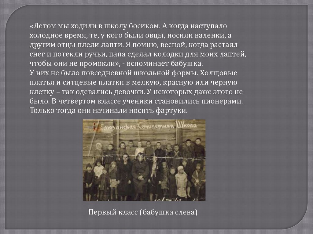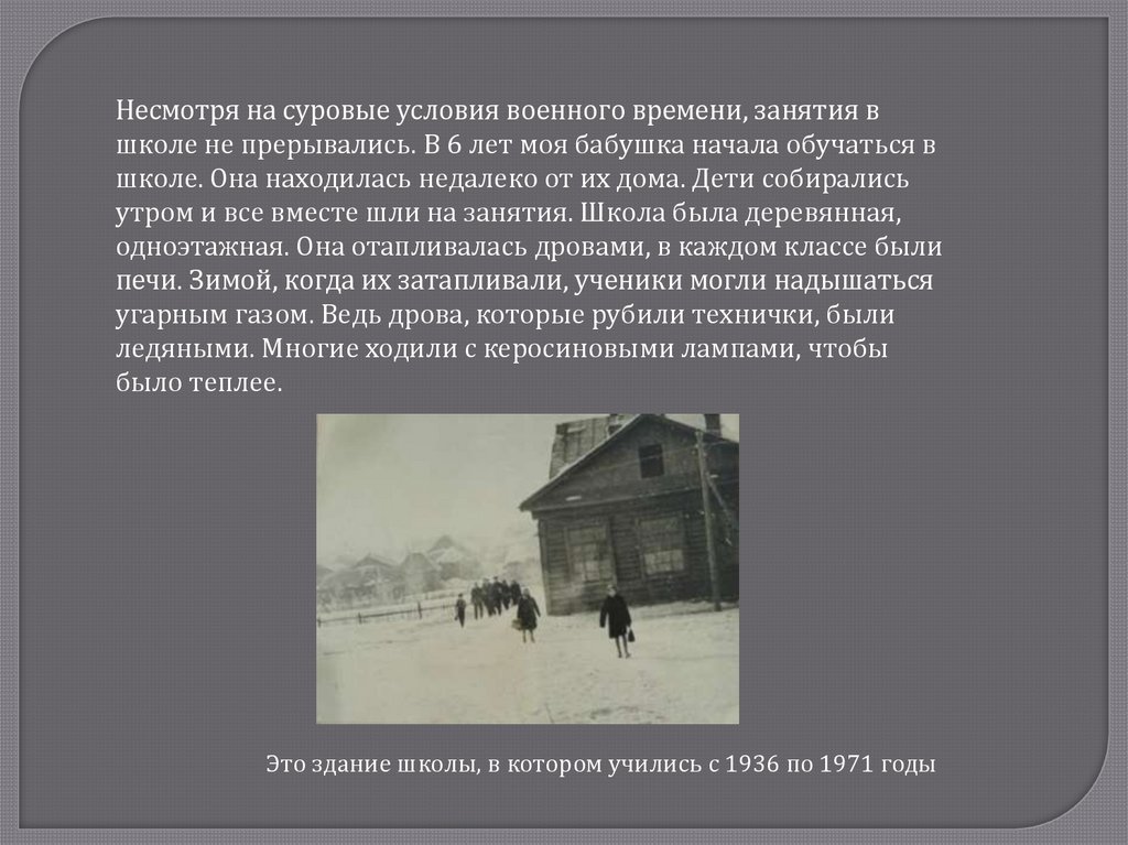Несмотря на суровые условия военного времени, занятия вшколе не прерывались. В 6 лет моя бабушка начала обучаться в