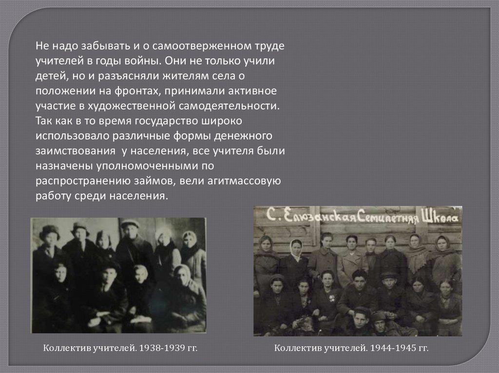 Не надо забывать и о самоотверженном трудеучителей в годы войны. Они не только учили