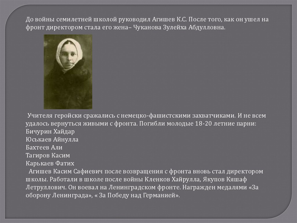 До войны семилетней школой руководил Агишев К.С. После того, как он ушел нафронт директором стала его жена– Чуканова Зулейха Абдулловна.