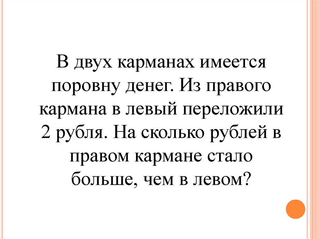 В двух карманах имеетсяпоровну денег. Из правого