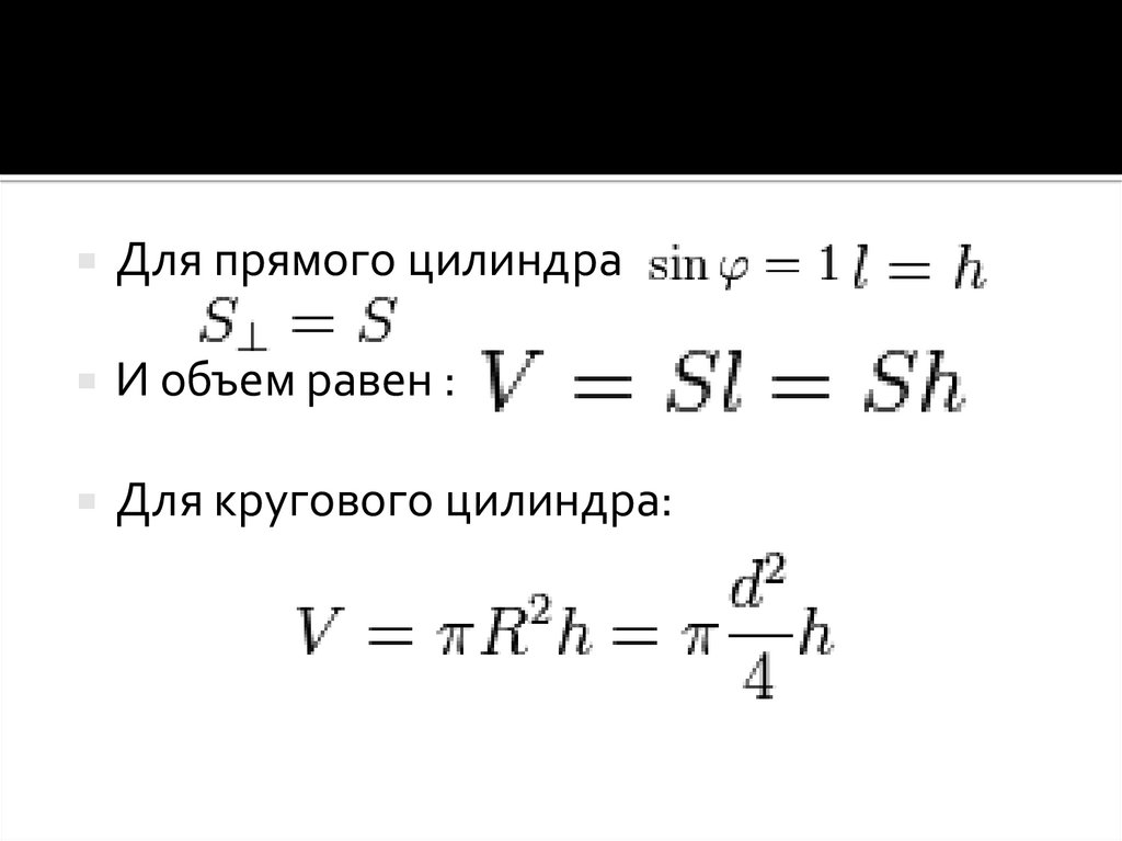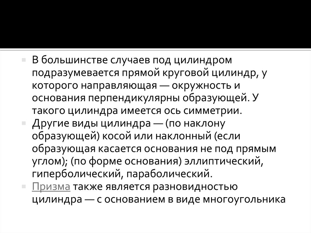 В большинстве случаев под цилиндромподразумевается прямой круговой цилиндр, у