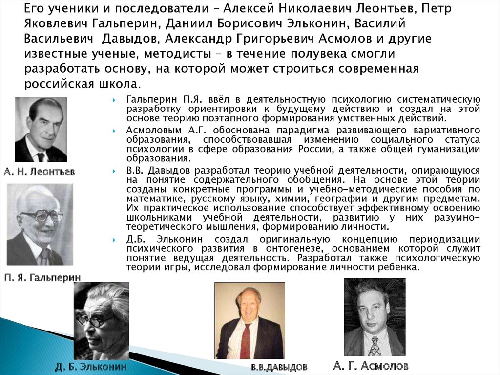 Его ученики и последователи – Алексей Николаевич Леонтьев, ПетрЯковлевич Гальперин, Даниил Борисович Эльконин, Василий