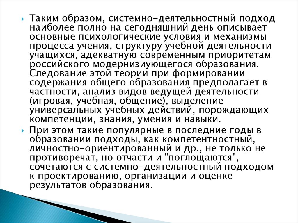 Таким образом, системно-деятельностный подходнаиболее полно на сегодняшний день описывает