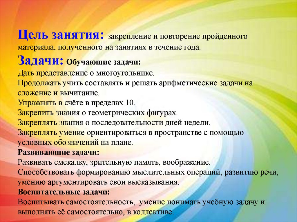 Цель занятия: закрепление и повторение пройденногоматериала, полученного на занятиях в течение года.