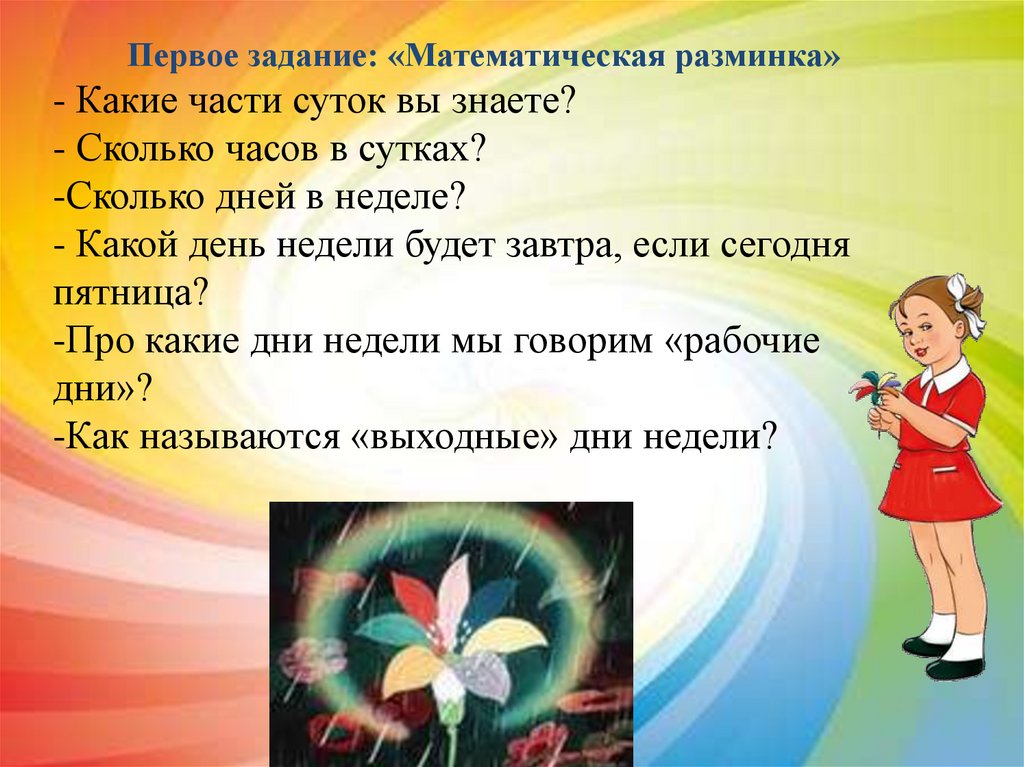Первое задание: «Математическая разминка»- Какие части суток вы знаете?