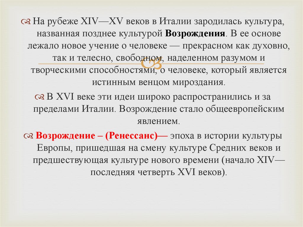 На рубеже XIV—XV веков в Италии зародилась культура,названная позднее культурой Возрождения. В ее основе