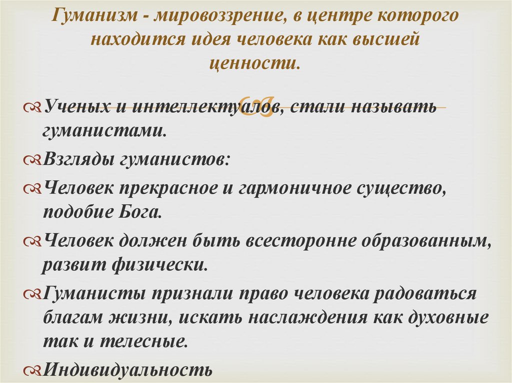 Гуманизм - мировоззрение, в центре которогонаходится идея человека как высшей
